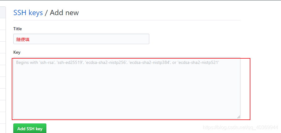 这个时候他便会弹出你的密钥。这个时候直接复制粘贴到GitHub设置密钥SSH的key上面然后保存即可