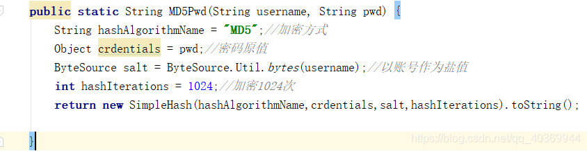 ByteSource salt = ByteSource.Util.bytes(username);//以账号作为盐值