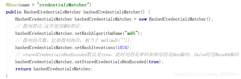 hashedCredentialsMatcher.setHashAlgorithmName("md5");