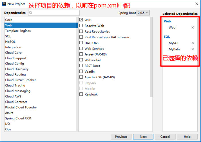 5.3在初始依赖的导入时勾选要导入的包,比如Web、MySQL等,可以只选择支持Web,其它的都在pom.xml中导入依赖。