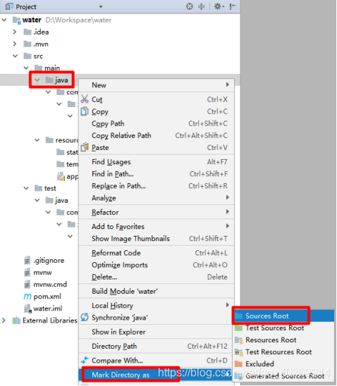 注意:在这里要将java文件夹设置为:Sources Root;将test文件夹设置为:Test Sources Root