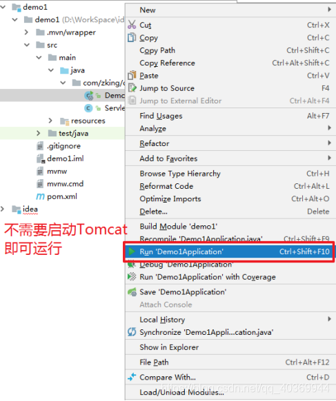 Spring Boot内置集成了Tomcat,所以无需启动Tomcat即可执行Demo1Application.java中的main方法。