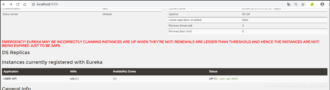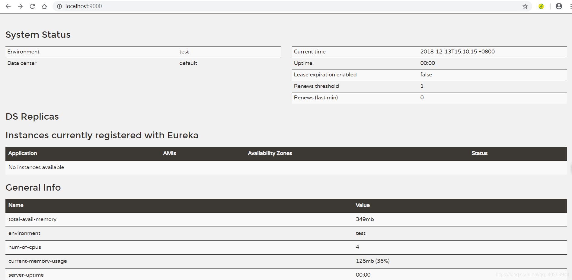 }启动项目完成后,浏览器访问 http://localhost:9000 查看 Eureka 服务监控界面 ,如下图: