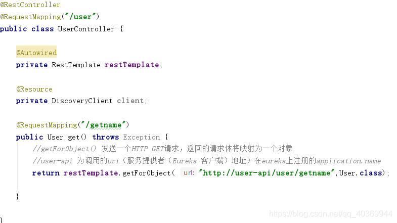 private DiscoveryClient client;    @RequestMapping("/getname")    public User get() throws Exception {        //getForObject() 发送一个HTTP GET请求,返回的请求体将映射为一个对象