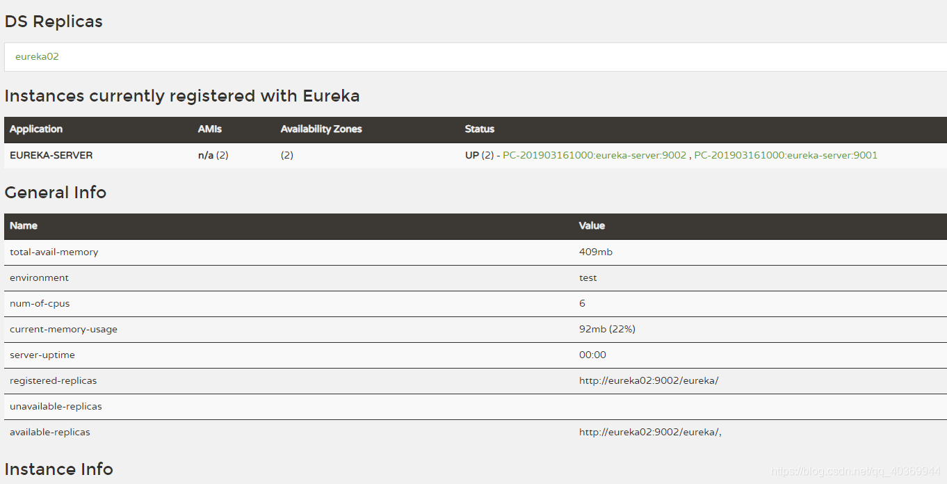 server: port: 9001 spring: application: name: eureka-server profiles: active: eureka01 eureka: instance: hostname: eureka01 # eureka 实例名称 client: # register-with-eureka: false # 不向注册中心注册自己 # fetch-registry: false # 是否检索服务 service-url: defaultZone: http://eureka01:9001/eureka/,http://eureka02:9002/eureka/