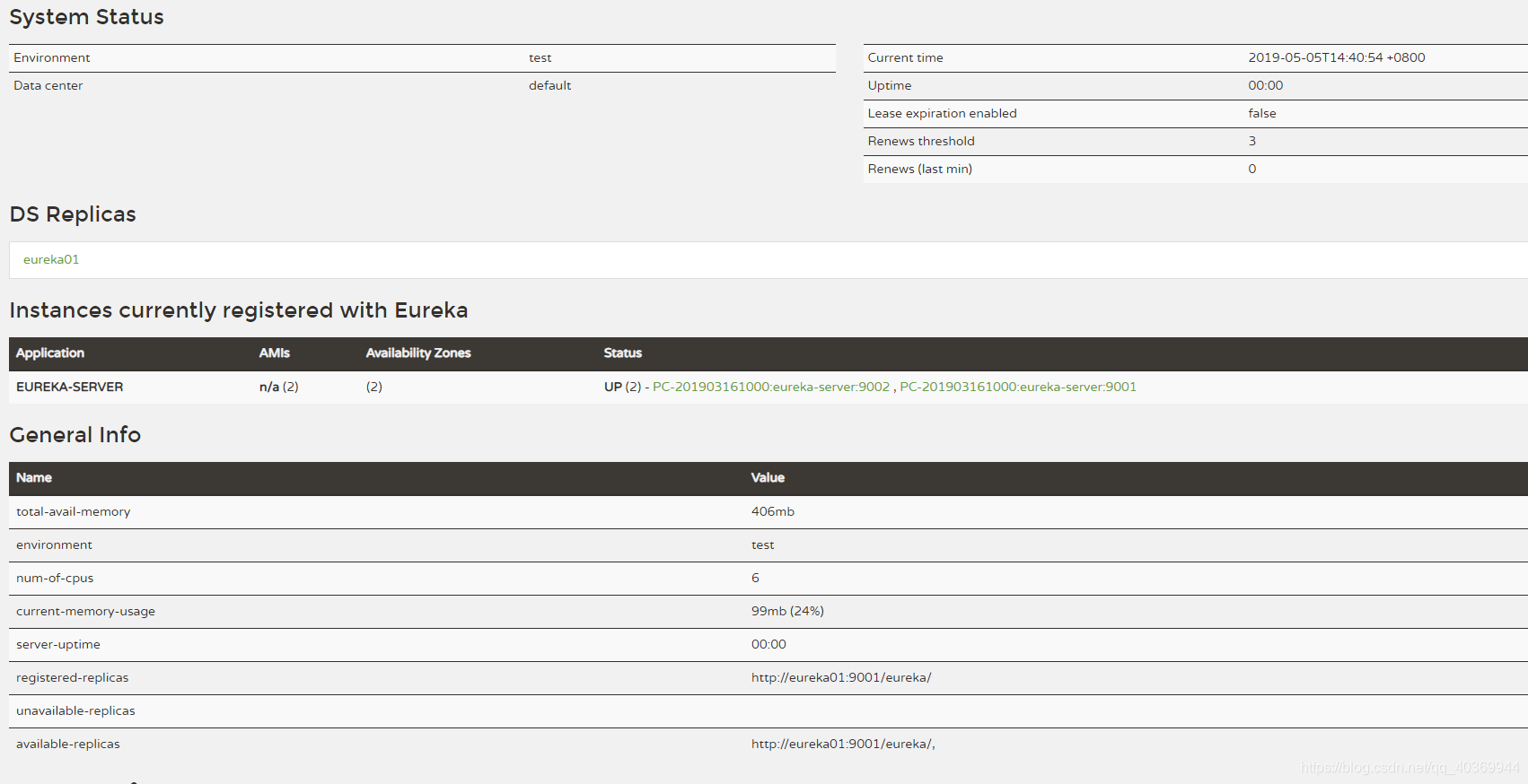 本次测试使用一台机器部署 Eureka 集群,通过名字和端口区分不同的 eureka 服务。